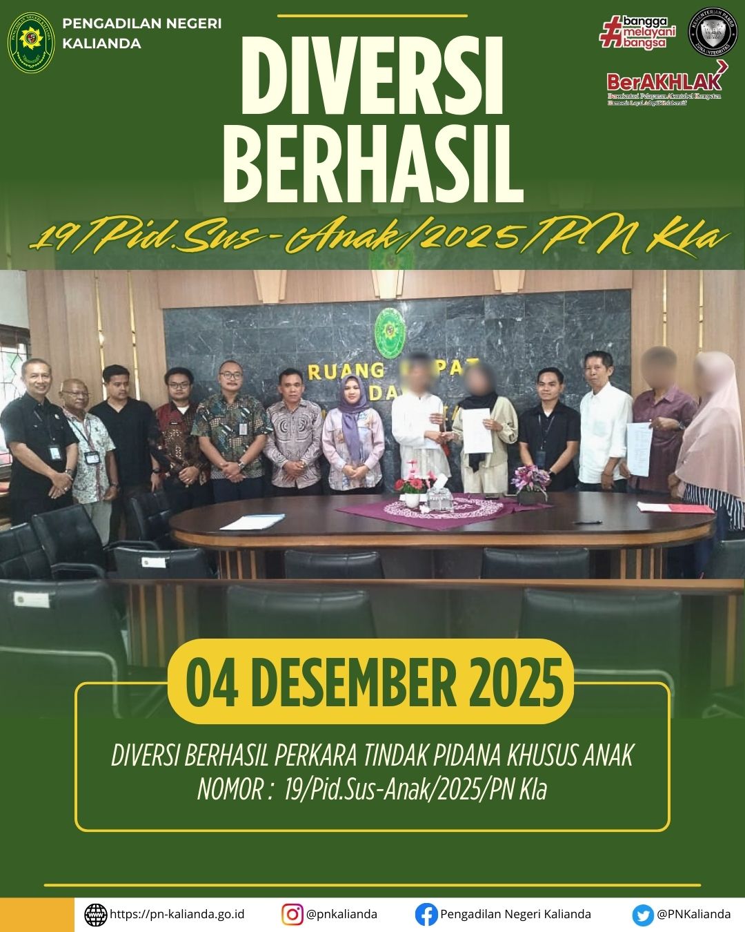 Kalianda, 04 Desember 2025 — Pengadilan Negeri Kalianda kembali melaksanakan upaya diversi dalam penyelesaian perkara pidana anak, sesuai dengan ketentuan Undang-Undang Nomor 11 Tahun 2012 tentang Sistem Peradilan Pidana Anak. Diversi tersebut dilaksanakan terhadap perkara Nomor 19/Pid.Sus.Anak/2025/PN Kla dan berjalan dengan baik hingga mencapai kesepakatan antara para pihak.